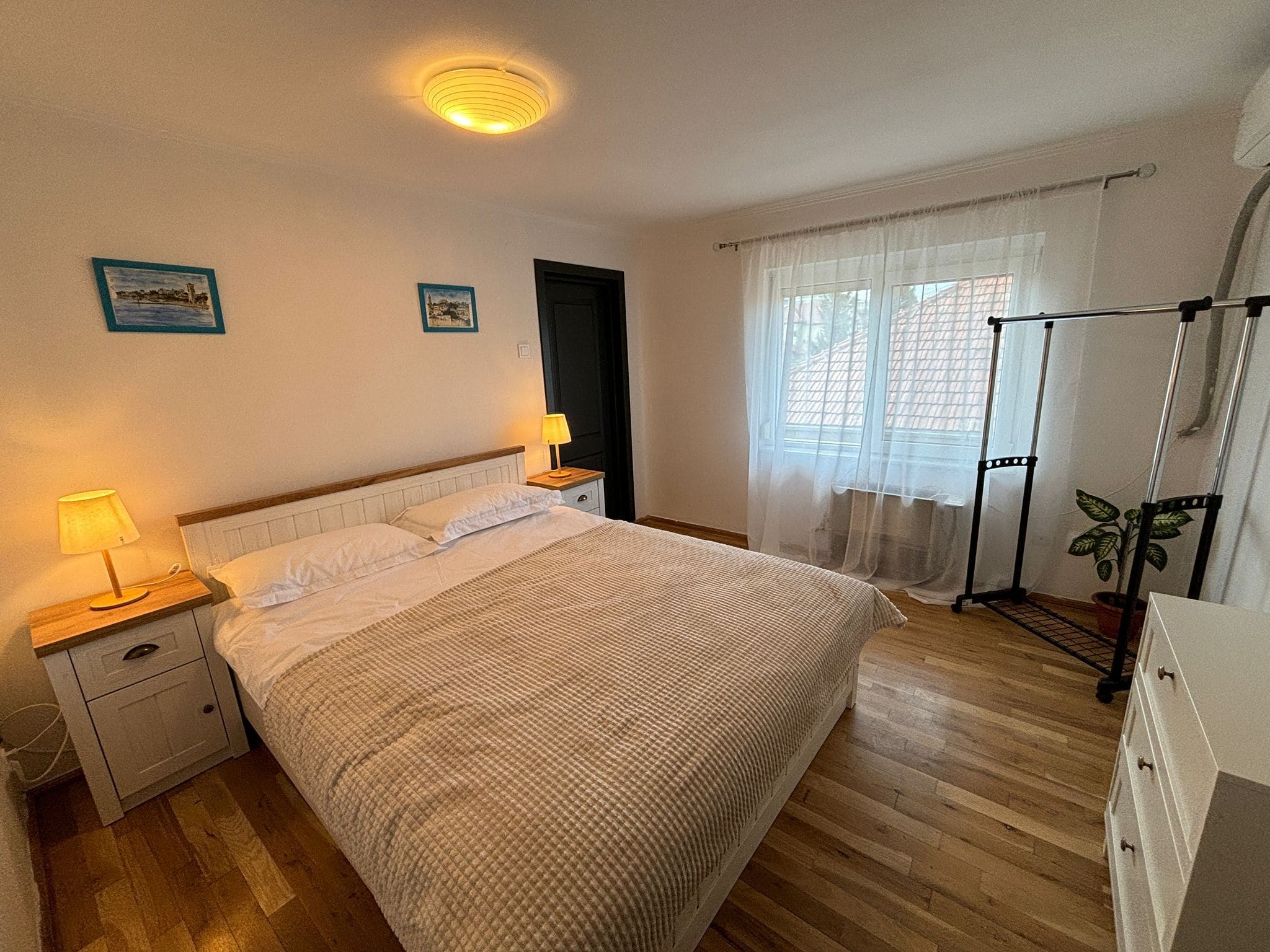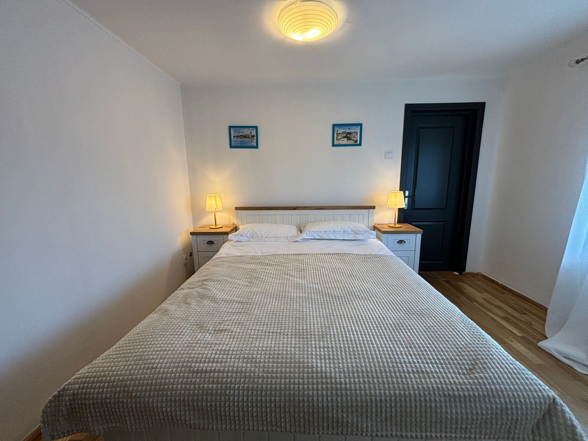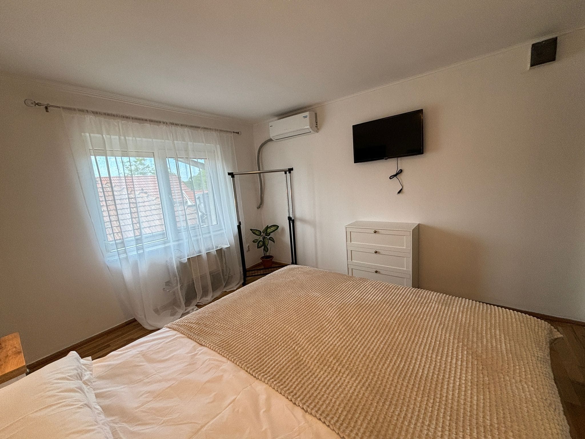 Camera dublă a Vilei Daddy din Deva oferă o combinație perfectă de confort și eleganță, ideală pentru o escapadă romantică sau un sejur relaxant în inima Transilvaniei. Decorată cu gust, camera dispune de un pat matrimonial confortabil, lenjerie de calitate superioară și perne pufoase, garantând o odihnă de neuitat. Fereastra mare permite luminii naturale să inunde încăperea, creând o atmosferă caldă și primitoare.
